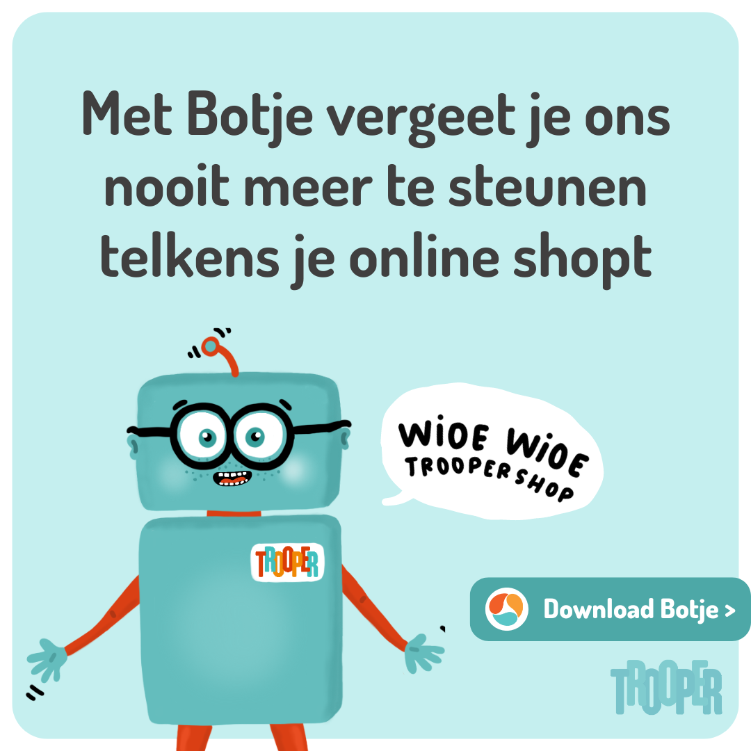 Je hebt net iets online gekocht en denkt dan doemme, dedju, miljaar, ik ben compleet vergeten langs de Trooperpagina van de chiro te passeren. Niet uit slechte wil ofzo hé, gewoonweg vergeten. Voor jou maakt dat niet meteen iets uit, jij krijgt je pakketje snel geleverd, maar wij krijgen geen commissie, omdat je niet via Trooper bent gegaan. Volgende keer dan? En het dan weer vergeten? Da's kak. Wel: hier is dé oplossing: Botje!